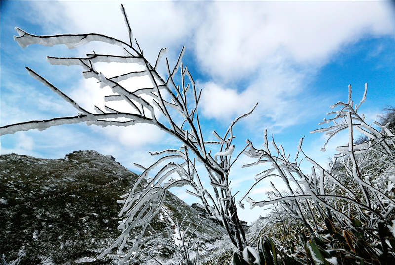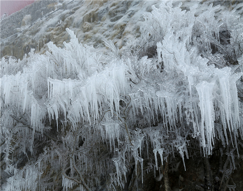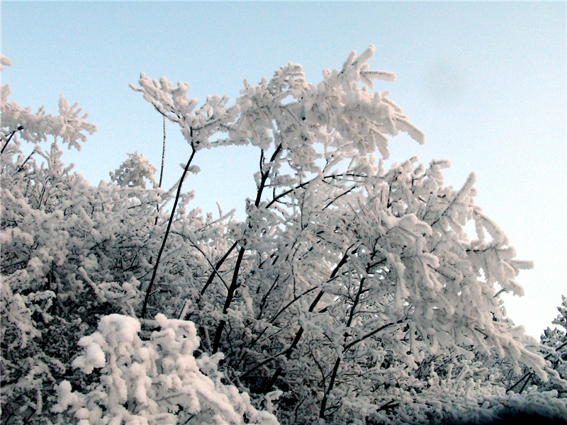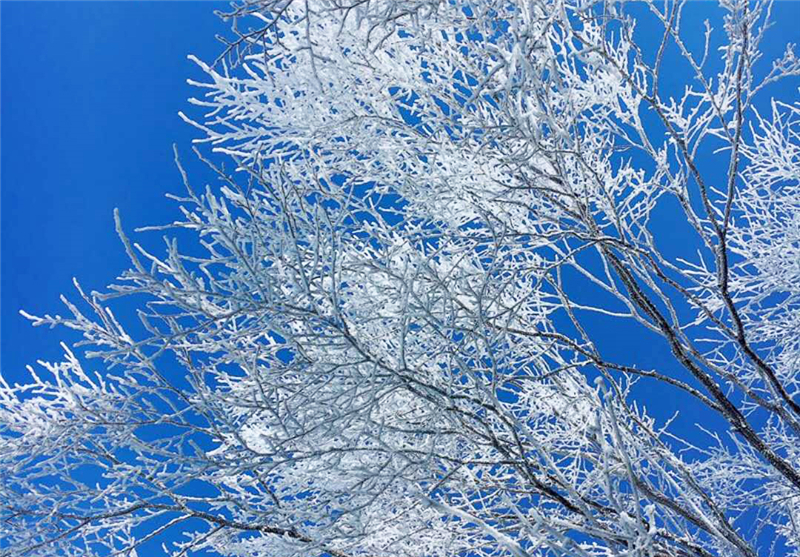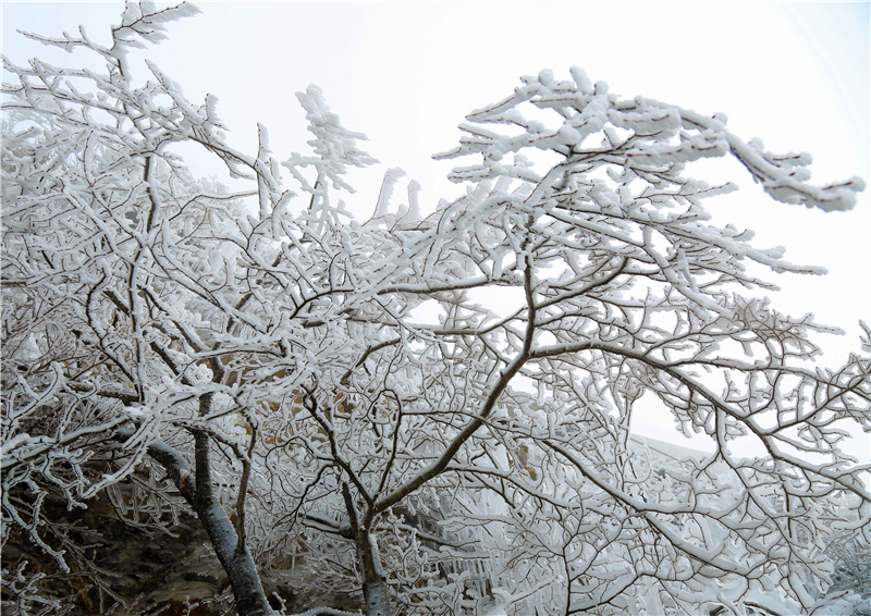 “草木之花多五出、唯有雪花有六角”,晶莹透亮的雪花在形态各异的枝丫上显得更加冰清玉洁、一尘不染。