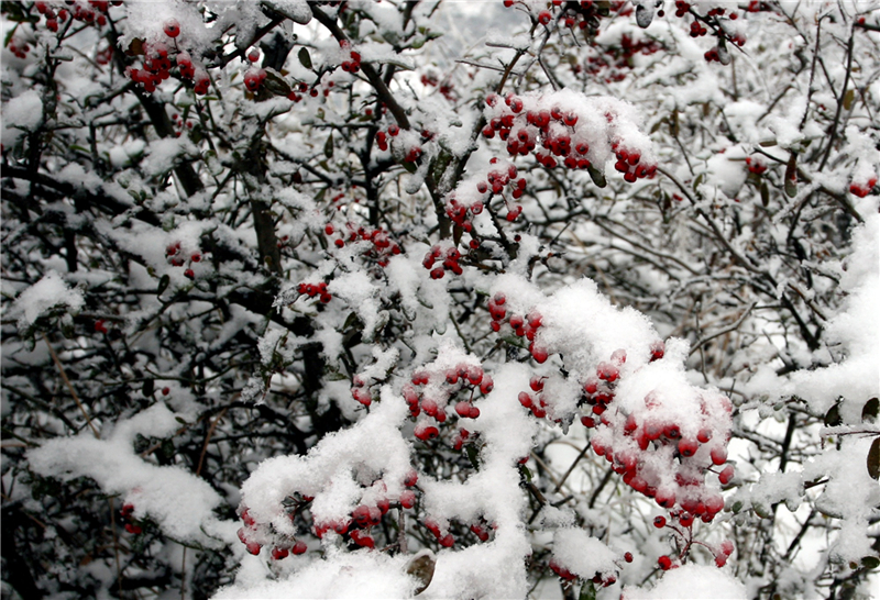 漫山遍野的沙棘灌丛,在洁白的雪花下,红装素裹,分外妖娆。