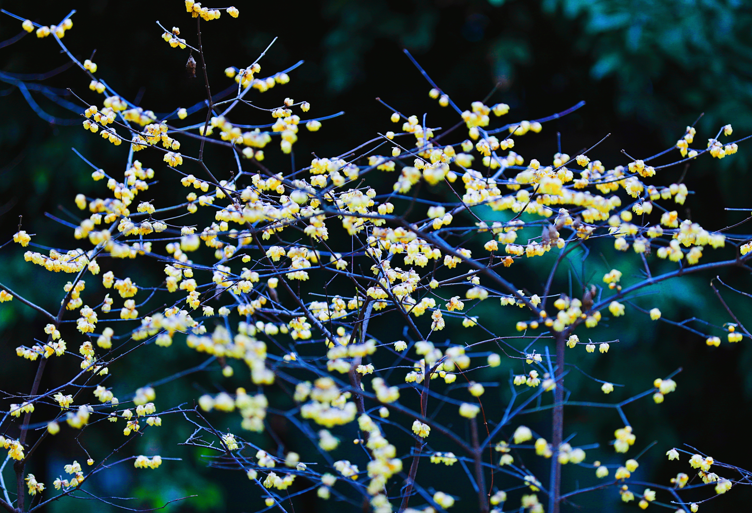 腊梅树枝干虬劲、傲骨铮铮,点点梅花好似无数星星,落在枝头,闻风轻颤。