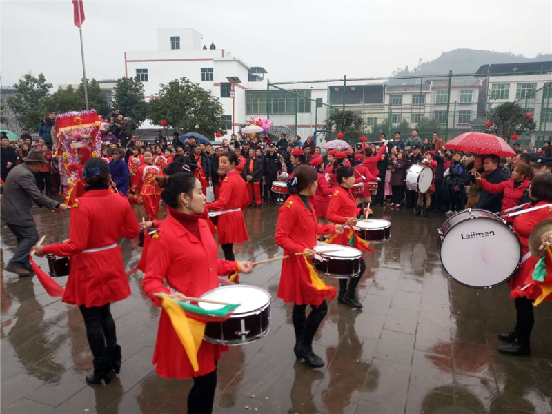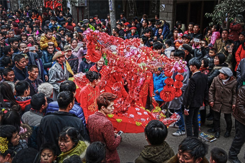 鞭炮响起锣鼓敲,人潮如流瞧社火。