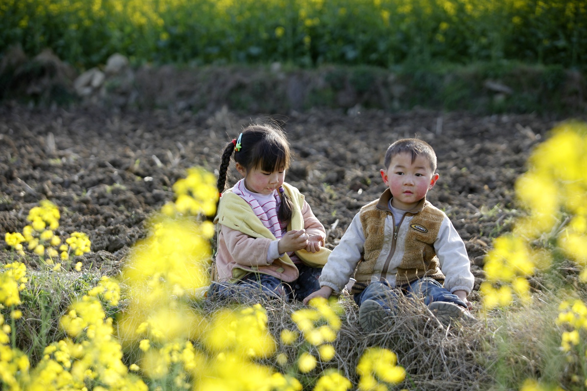 田坎上天真的孩童,注视着大人们劳作的场面,感受春的芬芳。