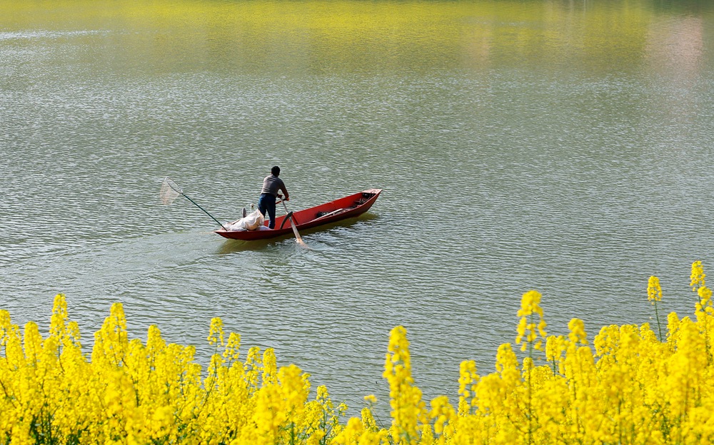 冰河苏醒、鱼跃水欢,渔民摇舟、下河捕鱼。